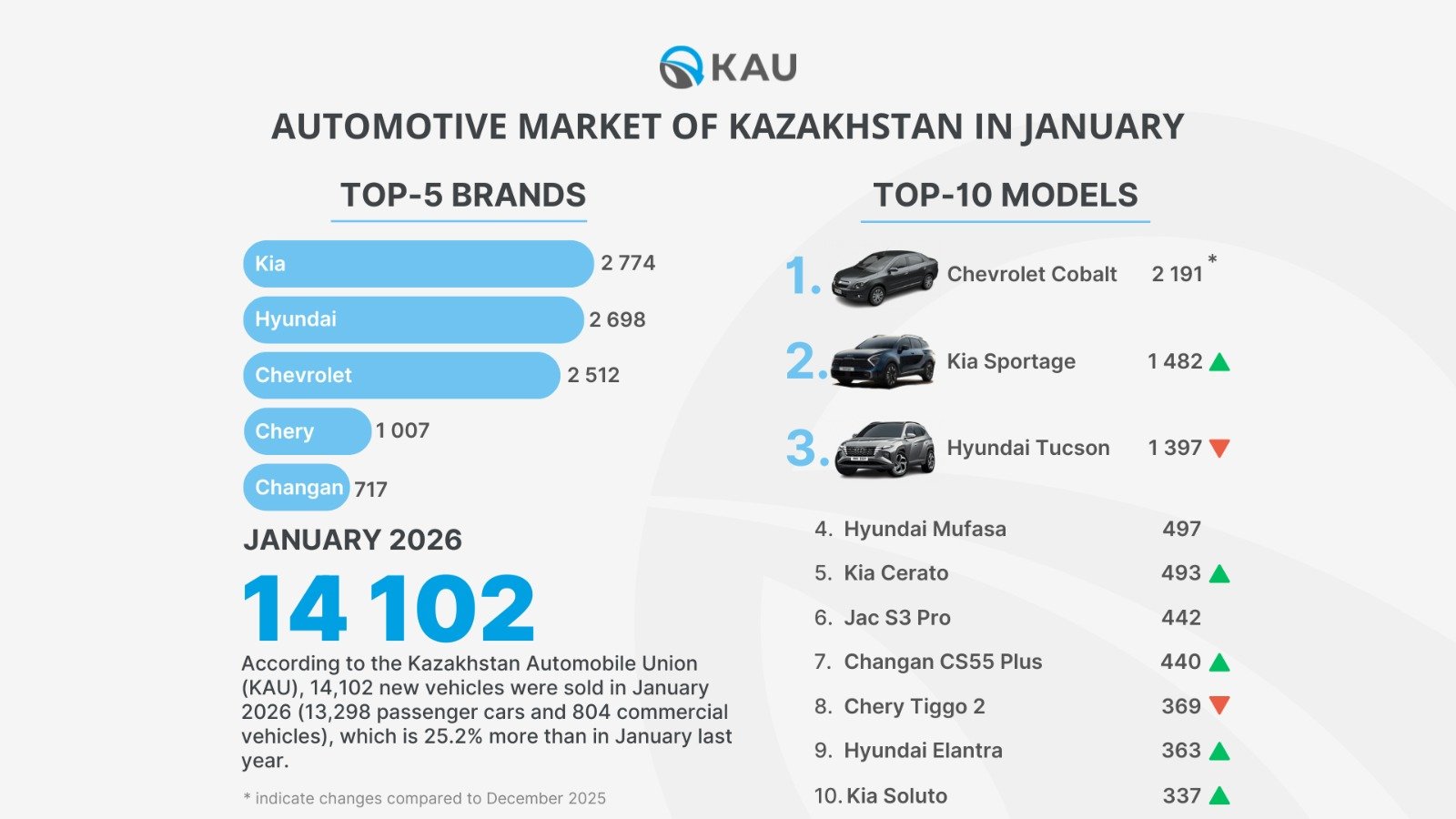 According to the Kazakhstan Automobile Union (KAU), 14,102 new vehicles were sold in January 2026 (13,298 passenger cars and 804 commercial vehicles), which is 25.2% more than in January last year.