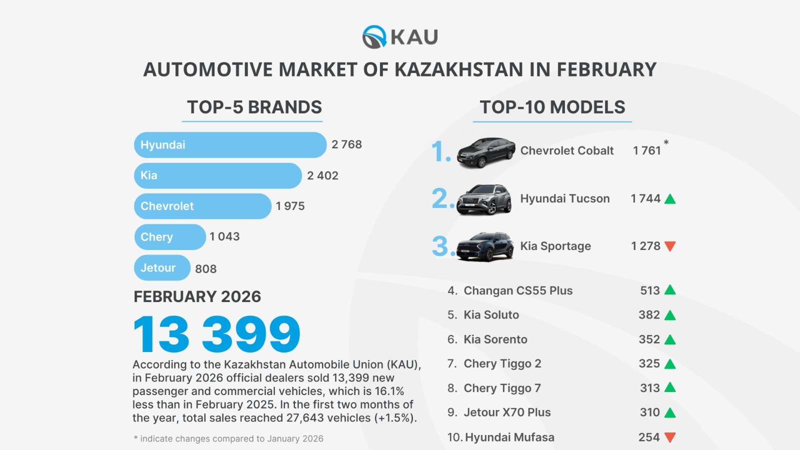 According to the Kazakhstan Automobile Union (KAU), in February 2026 official dealers in Kazakhstan sold 13,399 new passenger and commercial vehicles, which is 16.1% lower than in February of the previous year. As a result of the first two months, 27,643 vehicles were sold, which is 1.5% higher than in the same period last year.