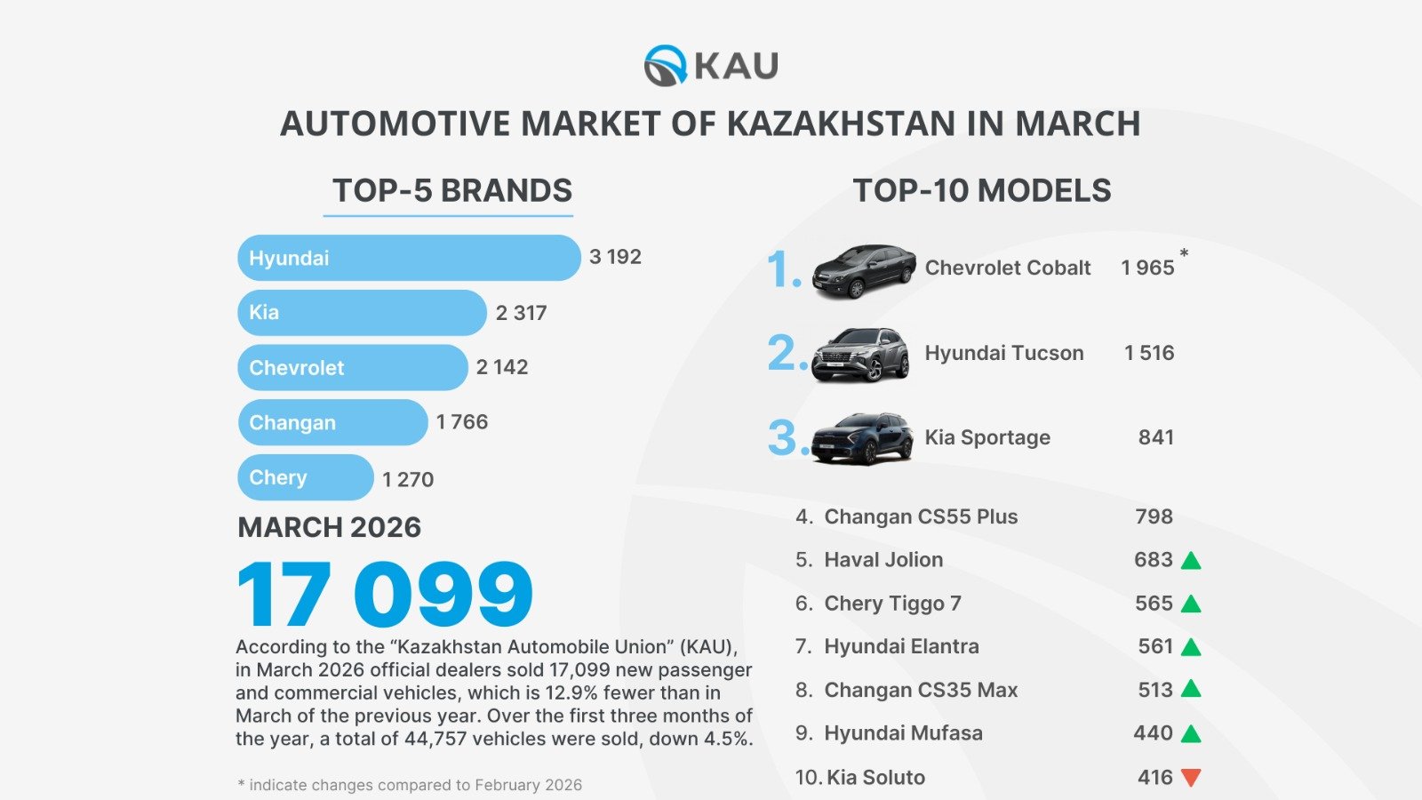 At the top of the ten most popular models in March was the Chevrolet Cobalt with (1,965 units) sold. In second place was the Hyundai Tucson with (1,516 units), while the Kia Sportage ranked third with (841 units). The Changan CS55 Plus remained in fourth place for the second month in a row with (798 units), followed by the Haval Jolion with (683 units) and the Chery Tiggo 7 with (565 units). The Hyundai Elantra ranked seventh with (561 units). The market newcomer Changan CS35 Max climbed to eighth place with (513 units), while the Hyundai Mufasa with (440 units) and Kia Soluto with (416 units) completed the top ten. All models are produced in Kazakhstan.