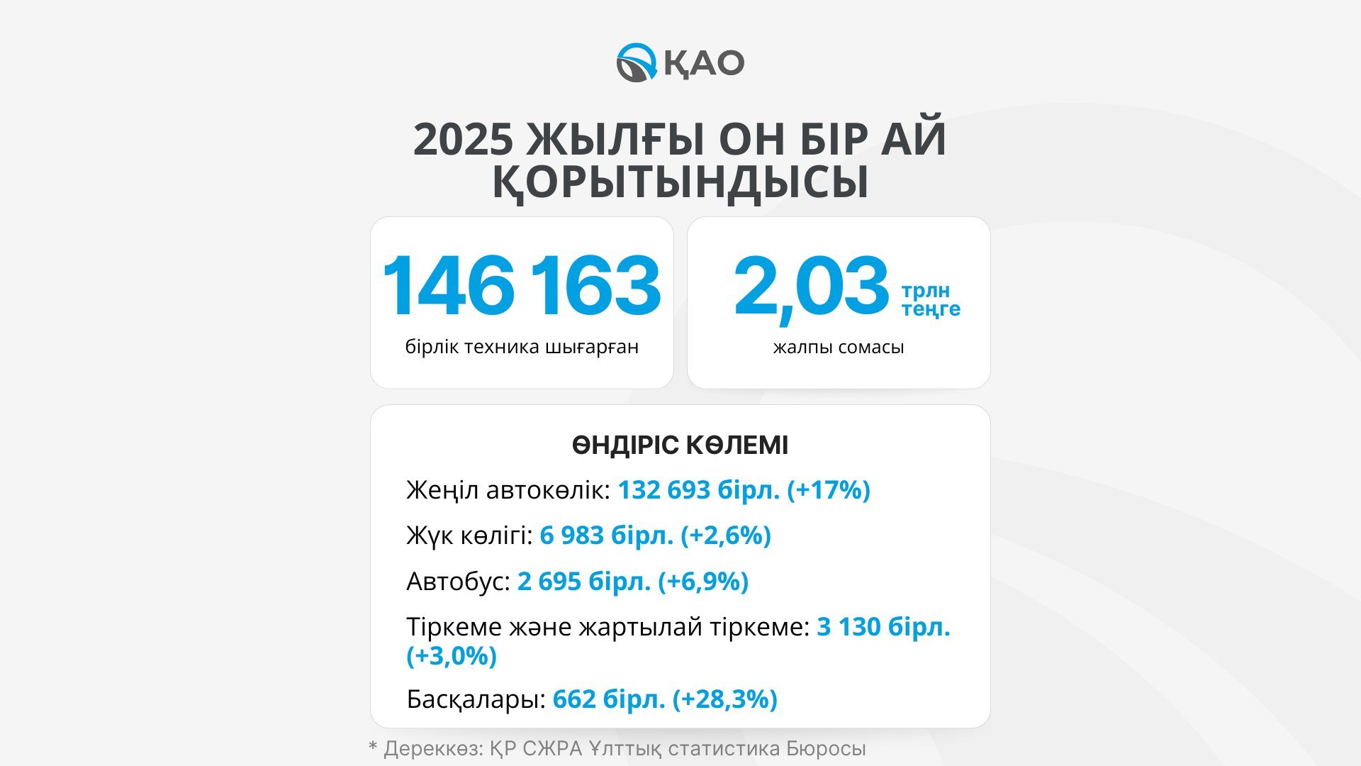 ҚР Ұлттық статистика бюросының дерегінше 2025 жылдың қарашасында Қазақстандағы зауыттар жалпы құны 311,1 млрд теңге болатын 22 580 бірл. техника өндірген, бұл – биылғы ең жақсы нәтиже. Өткен қарашамен салыстырғанда өндіріс көлемі 25,5% өсті. Дәл осы айда рекордтық 20 730 бірл. жеңіл автомобиль, 807 жүк көлігі, 646 автобус, 310 жартылай тіркеме мен тіркеме, 87 бірл. басқа арнайы техника жасалды.