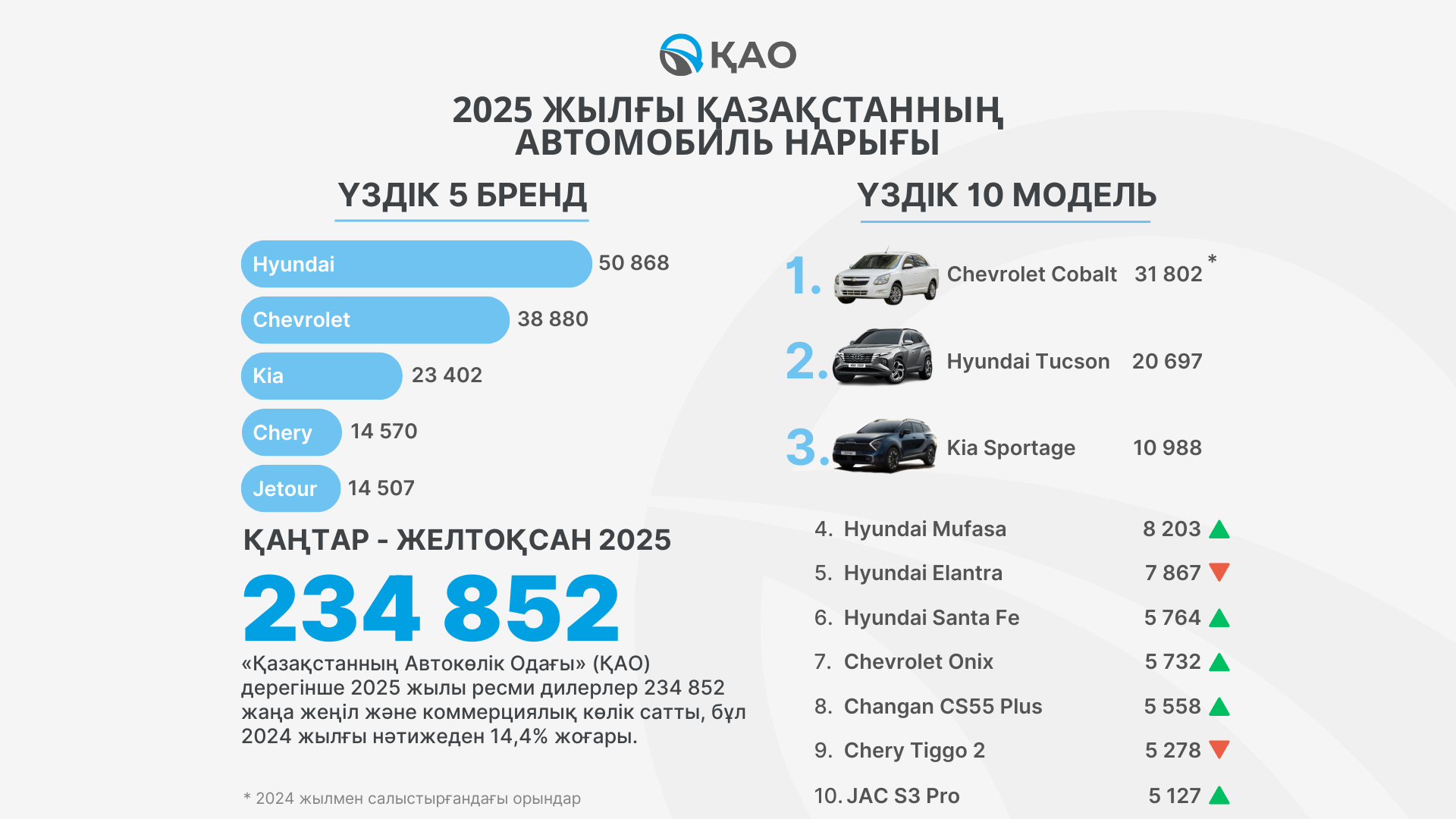 2025 жылғы сатылым қорытындысы бойынша Қазақстан Республикасындағы ең танымал брендтер ондығында Hyundai көшбасшылығын сақтап қалды. Қаңтар-желтоқсан айларында 50 868 Hyundai автокөлігі сатылды (+15,4%). Екінші орында Chevrolet – 38 880 бірл. (+25,7%). Үшінші орынды Kia иеленді – 23 402 бірл. (+1,5%). Жыл бойы төртінші орын үшін қытайлық екі бренд бәсекелесті: Chery (14 570 бірл.; -2,1%) және Jetour (14 507 бірл.; +52,6%). Жыл қорытындысы бойынша Haval алтыншы орында (11 688 бірл.; +6,4%). Toyota жетінші орында – 11 338 бірл. (+2,7%). Сегізінші орында Changan маркасы – 11 260 бірл. (+32,3%). ТОП-10 тізімін Jac (10 330 бірл.; -12,2%) және Geely (9 621 бірл.; +16,6%) енді.