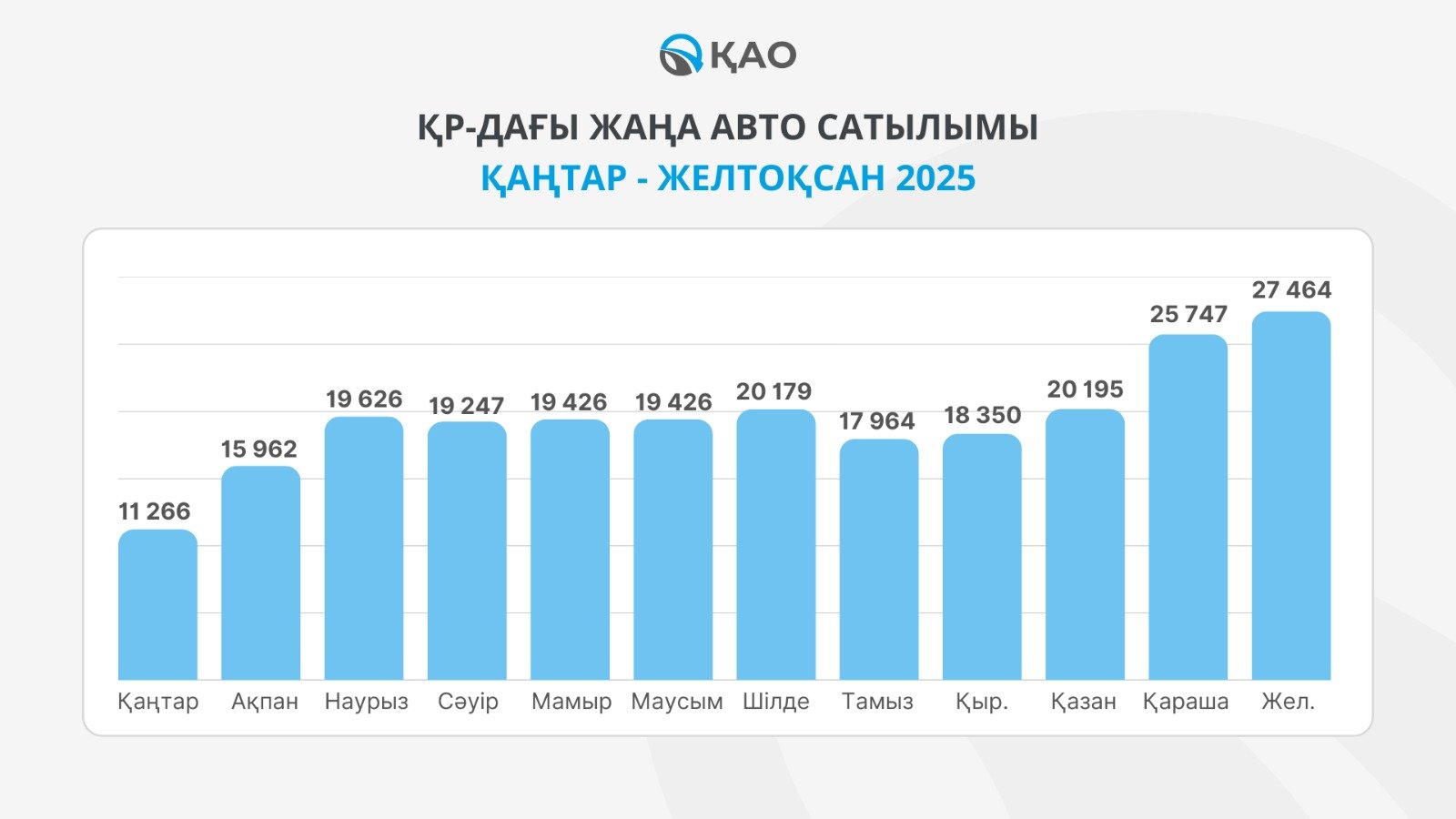 «Қазақстанның Автокөлік Одағы» (ҚАО) дерегінше 2025 жылғы желтоқсанда ресми дилерлер 27 464 жаңа жеңіл және коммерциялық көлік сатты, бұл өткен жылғы рекордтық желтоқсанмен салыстырғанда 7,3%-ға артық. 2025 жылдың қорытындысы бойынша сатылым көлемі 234 852 автокөлікті құрады, бұл алдыңғы жылдың қаңтар-желтоқсан айларымен салыстырғанда 14,4%-ға жоғары. Осылайша, Қазақстандағы жаңа автокөліктер нарығы қатарынан екінші жыл 200 мыңнан астам сатылған көлік көрсеткішінен асты.