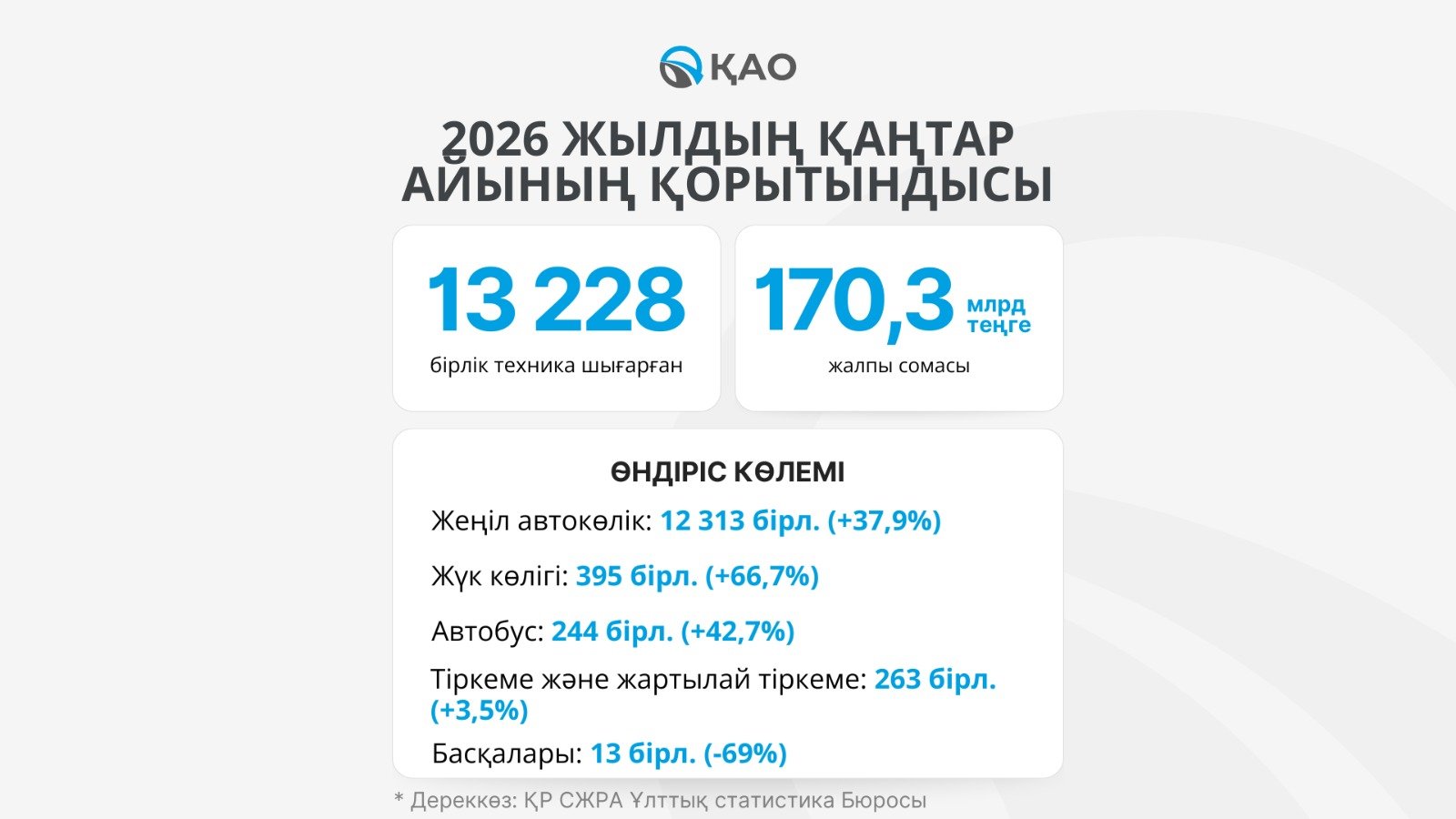 ҚР Ұлттық статистика бюросының мәліметінше, 2026 жылғы қаңтарда Қазақстанда жалпы құны 170,3 млрд теңгені құрайтын 13 228 бірлік техника өндірілді. Өндіріс көлемі 2025 жылғы қаңтармен салыстырғанда 37,3%-ға артты. Есепті айда 12 313 жеңіл автомобиль, 395 жүк көлігі, 244 автобус, 263 тіркеме мен жартылай тіркеме, сондай-ақ 13 бірлік арнайы және мамандандырылған техника шығарылды.
