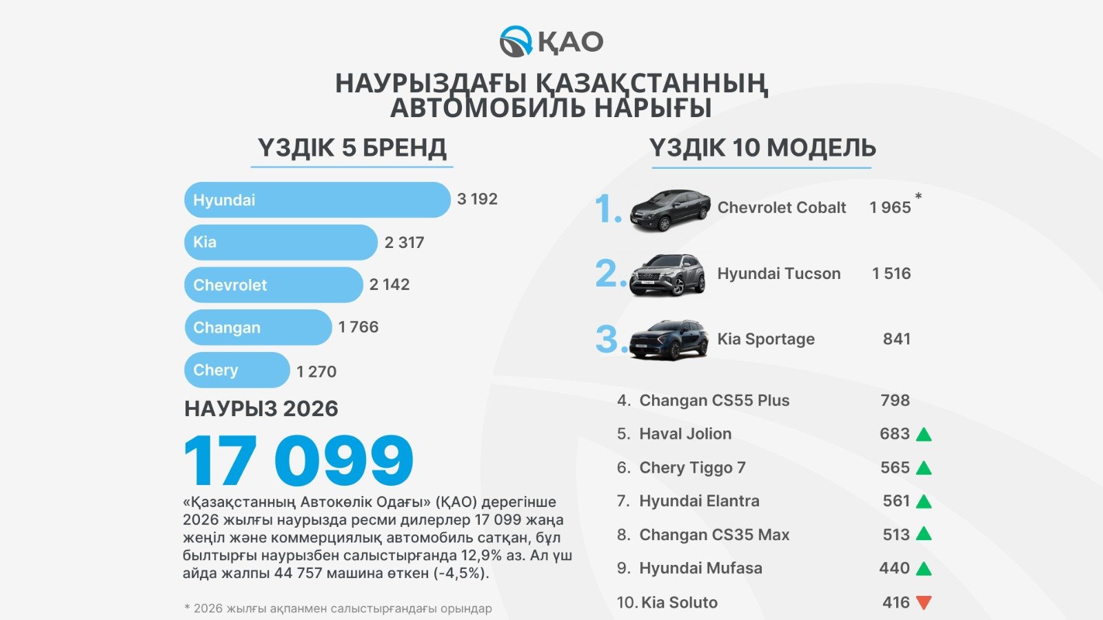 - Наурыздағы топ-5: Hyundai, Kia, Chevrolet, Changan, Chery