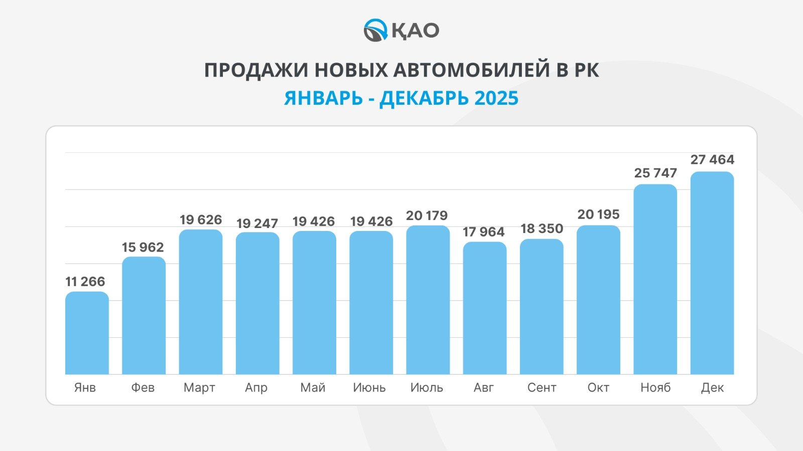 По данным «Қазақстанның Автокөлік Одағы» (ҚАО), в декабре 2025 года официальные дилеры реализовали 27 464 новых легковых и коммерческих автомобиля – на 7,3% больше рекордного декабря прошлого года. По итогам всего 2025 года объем продаж составил 234 852 автомобиля, что на 14,4% больше по сравнению с январем-декабрем предыдущего года. Таким образом, уже второй год подряд рынок новых автомобилей в Казахстане превышает отметку в 200 тысяч проданных единиц.