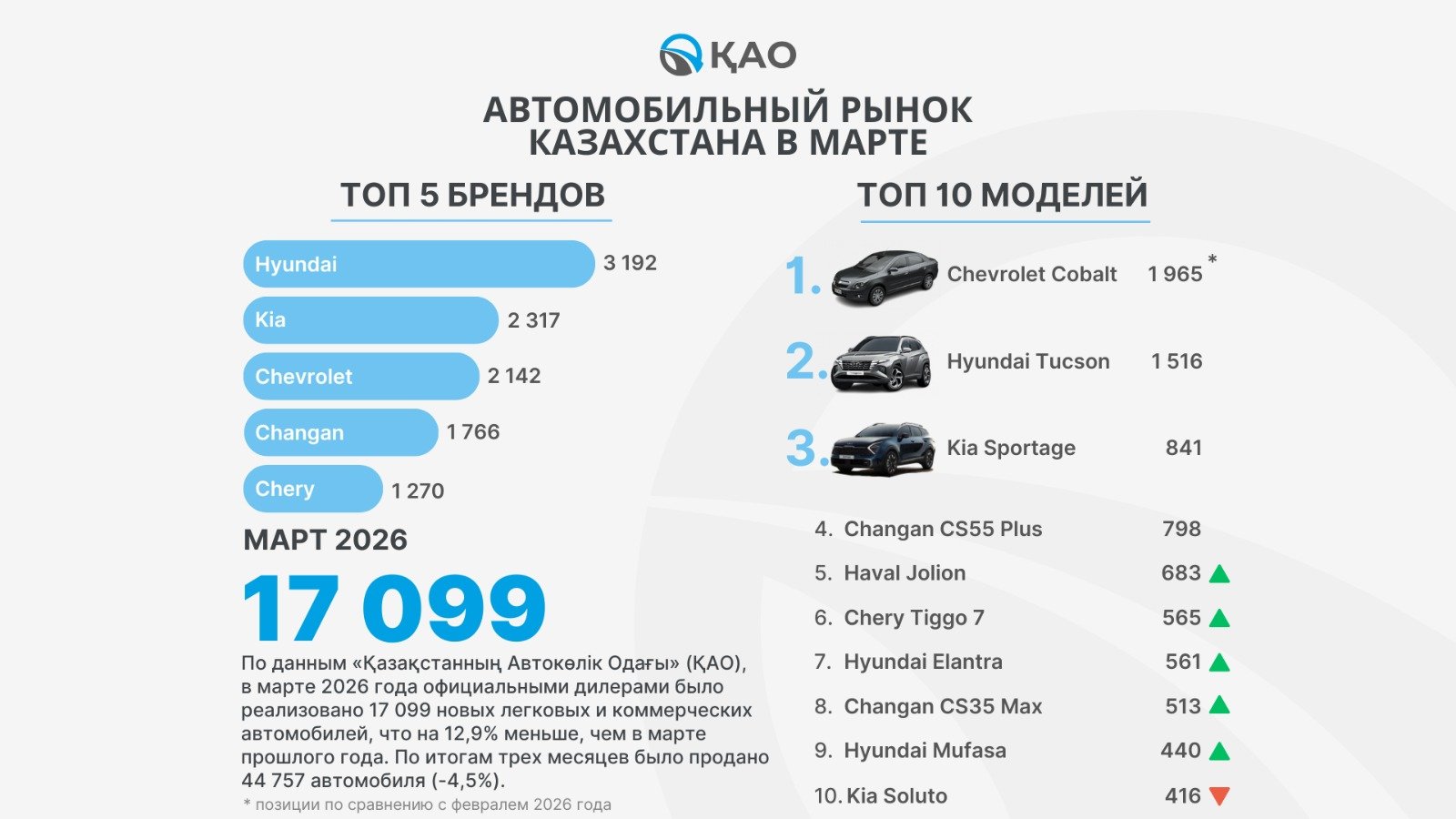 По данным «Қазақстанның Автокөлік Одағы» (ҚАО), в марте 2026 года официальными дилерами на территории Казахстана было реализовано 17 099 новых легковых и коммерческих автомобилей, что на 12,9% меньше, чем в марте прошлого года. По итогам трех месяцев было продано 44 757 автомобилей, что на 4,5% меньше, чем за аналогичный период прошлого года.